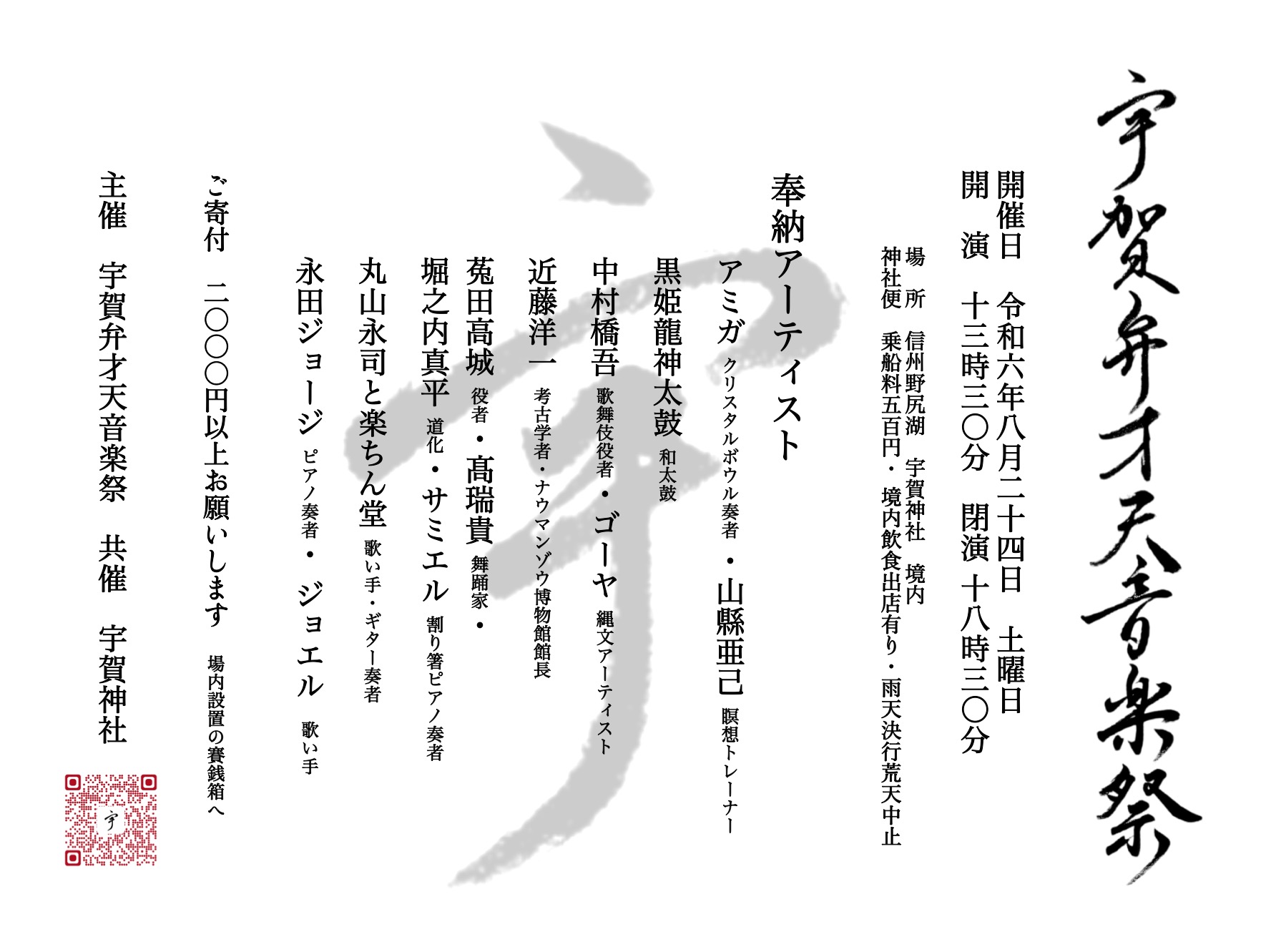 お知らせ 令和6年例祭・行事のお知らせ 2024.8.11 本年の例祭日時は、8月26日(月)午前11時、琵琶島本宮にて斎行いたします。例祭をご覧になりたい方は、午前10時出航の遊覧船等にご乗船ください。例年28日に行われる、神様を神輿にお移りいただき湖を見回れる湖上渡御は中止といたします。また、例祭前の24日(土)には、「宇賀弁才天音楽祭」が行われます。